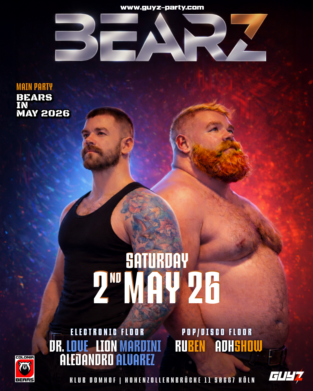 Mit BEARZ bringen die GUYZ Party und die COLONIA BEARS eine brandneue Partyreihe a den Start – laut, wild, bärtig, herzlich und voller Energie.